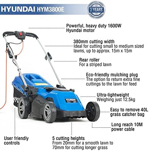 Hyundai 38cm Corded Electric 1600w 230v/240v Roller Mulching Lawnmower | HYM3800E