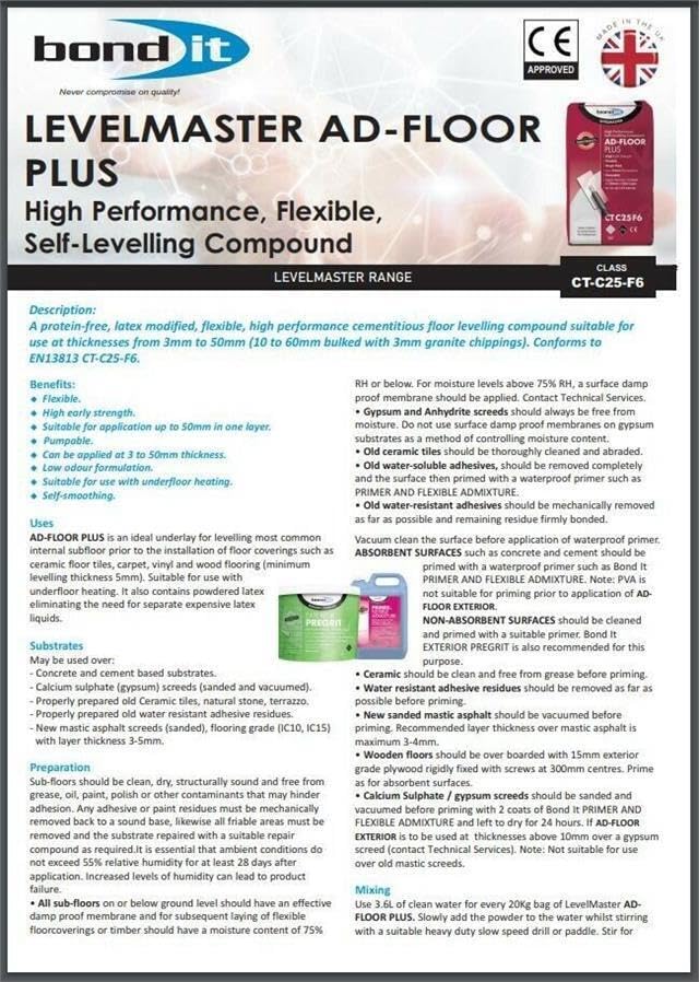 AD-FLOOR PLUS is an ideal underlay for levelling most common internal subfloor prior to the installation of floor coverings such as ceramic floor tiles, carpet, vinyl and wood flooring (minimum levelling thickness 5mm).