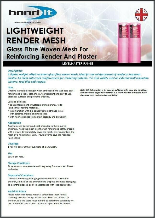 Apply an even background coat of render to the required thickness. Place the mesh into the wet render and lightly press in with a trowel to completely cover the mesh. Overlap joints in the mesh by a minimum of 5cm. Trowel over to give the required finish effect. Re-inforcement for waterproof membranes, felts and similar roofing materials. Distributes stress evenly when used with marble, stone and ceramic tiles. Maintains stability and durability when used with floorcoverings.