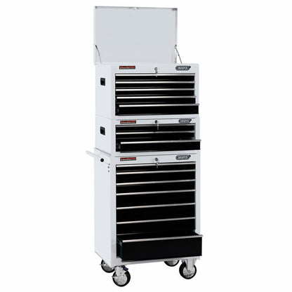 Fifteen drawer combined roller cabinet and tool chest. Attached with braked and swiveling castors and pulling handle for easy manoeuvrability. Manufactured from sheet steel with a protective powder coated finish. Drawers are fitted with ball bearing runners delivering a smooth operation and a secure locking system with two keys. Carton packed on pallet.