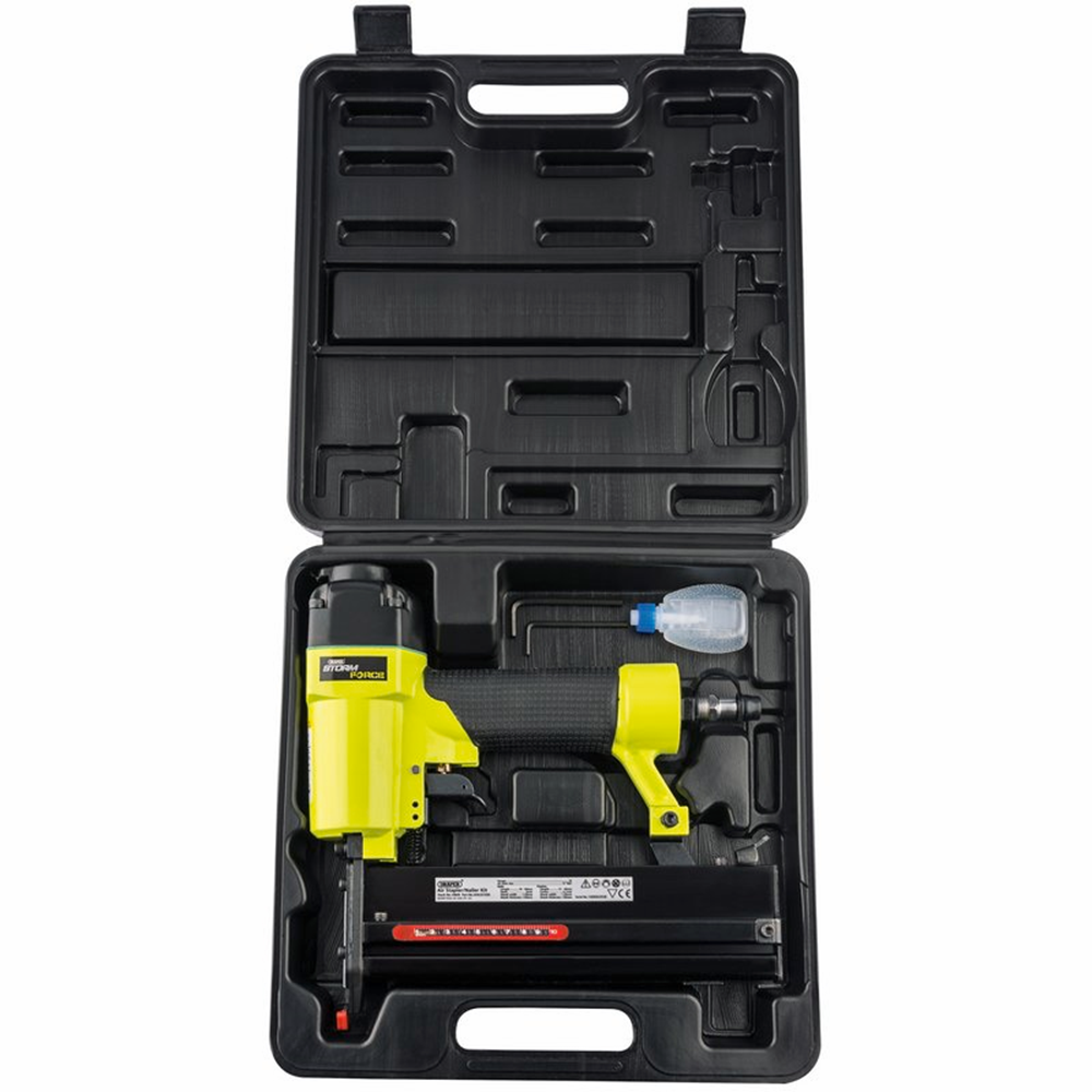 Air stapler/nailer, with quality cast aluminium housing. Attached with a nail holder and soft grip handle. Fitted with a safety bump mechanism that helps prevent accidental firing. Suitable for nails 10 - 50mm and staples 12 - 40mm long. Supplied complete with carrying case.