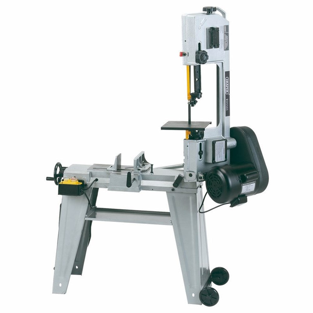 A versatile three - speed machine offering horizontal and vertical cutting capabilities. Designed for use in the maintenance workshop. The 350W motor gives smooth and accurate saw blade transmission through the adjustable ball bearing guides. Supplied with transport wheels, tool shelf, plastic blade guards and BS safety regulation guard. Push button on/off switch, cable and approved plug.###No-volt switch