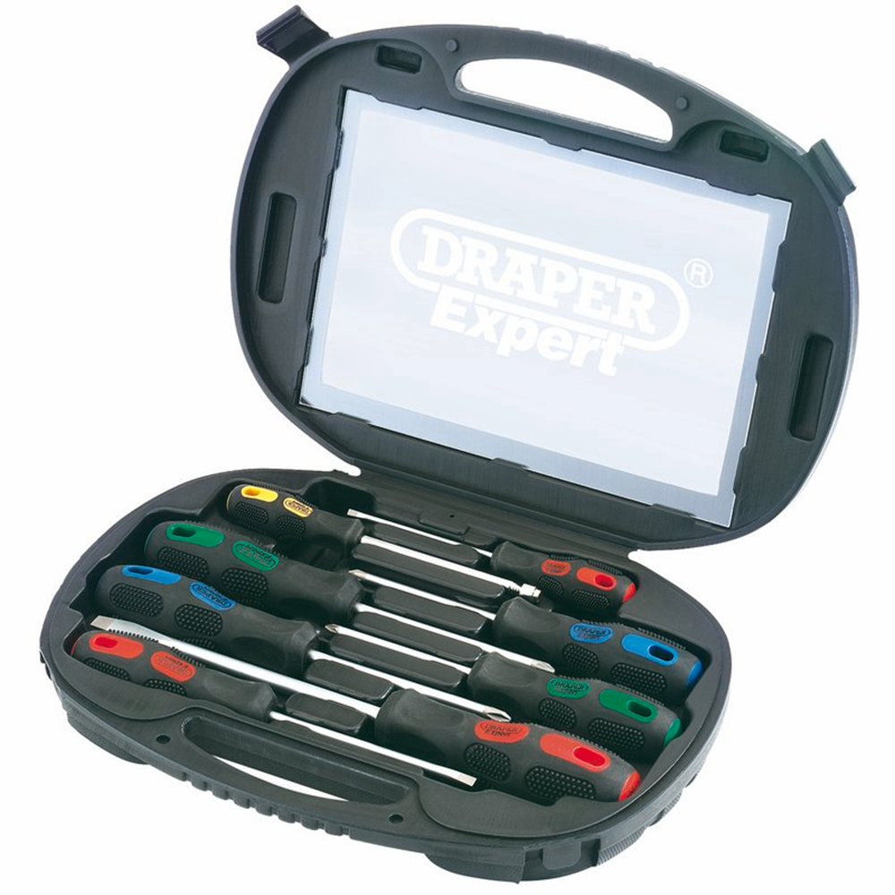 Expert Quality, screwdrivers with hardened SVCM satin chrome plated blades and sand blasted tips. The handle is manufactured from vulcanized 'soft grip' polymer which is colour coded for easy recognition. Packed in blow mould case with see - through lid.