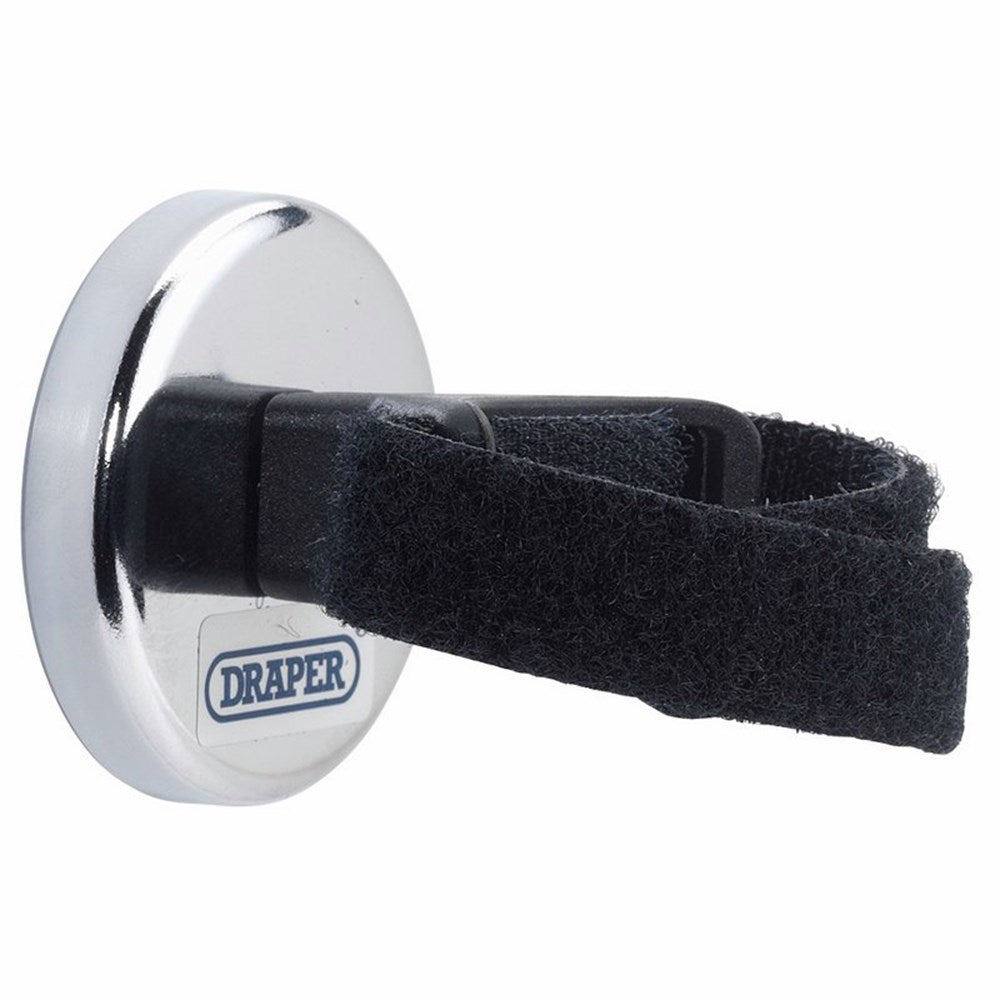 For attaching to the side of metal objects using powerful magnets. 50mm diameter. Hook and loop straps for holding different sized tools.