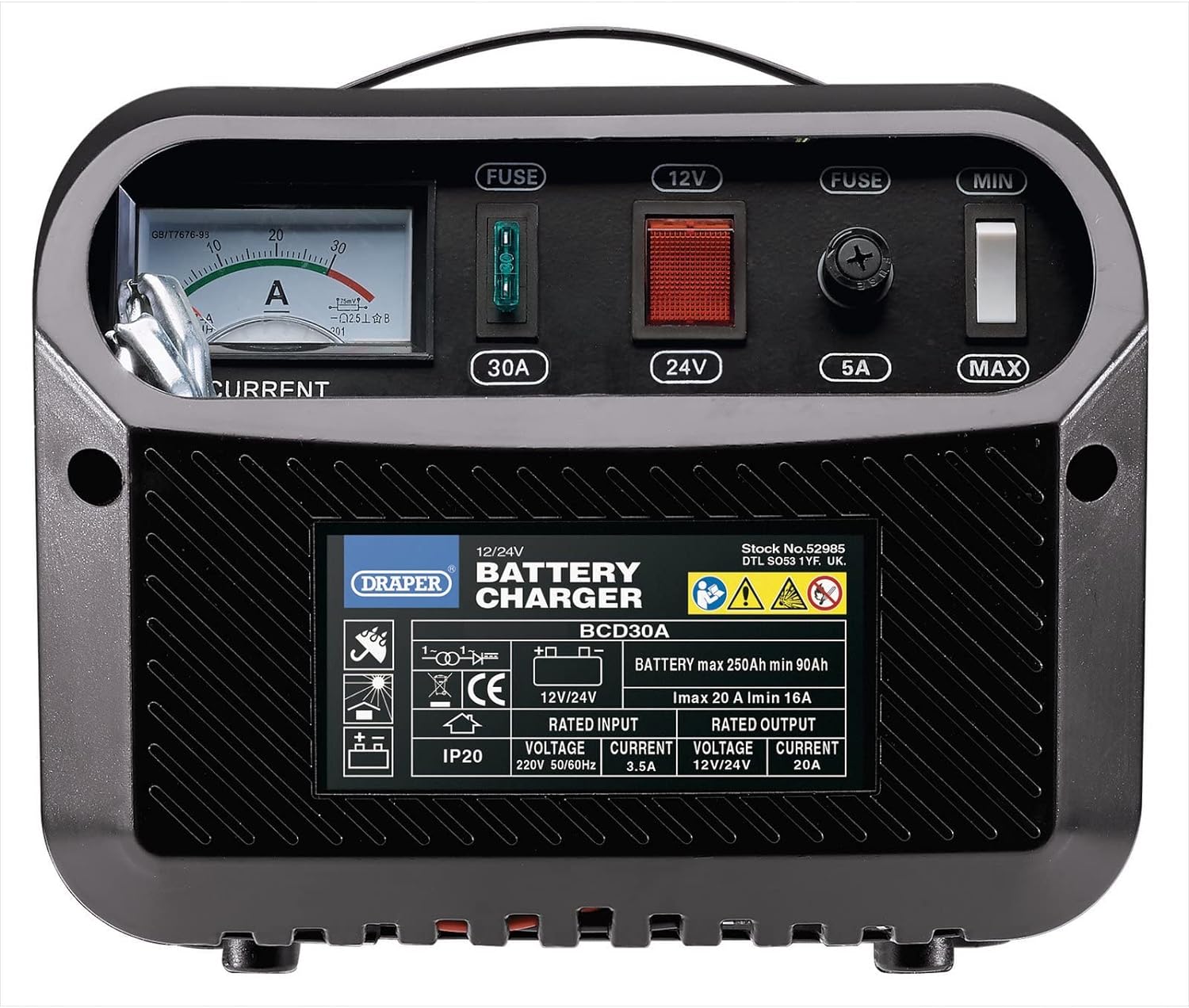 For workshop and home use. Suitable for conventional lead acid batteries up to 250Ah. Well-designed convenient machine with cable storage and fitted with an integral carry handle. Supplied with insulated copper leads and battery clips.