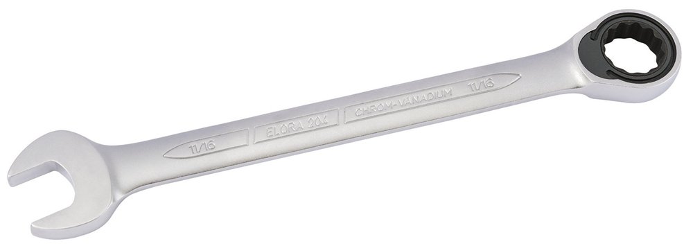 Open end set at 15°. ELO - Drive ring end manufactured with 72 teeth ratcheting mechanism - only 5° movement required to turn fastener, especially useful in confined spaces. Forged from chrome vanadium steel, hardened, tempered and matt chrome plated.