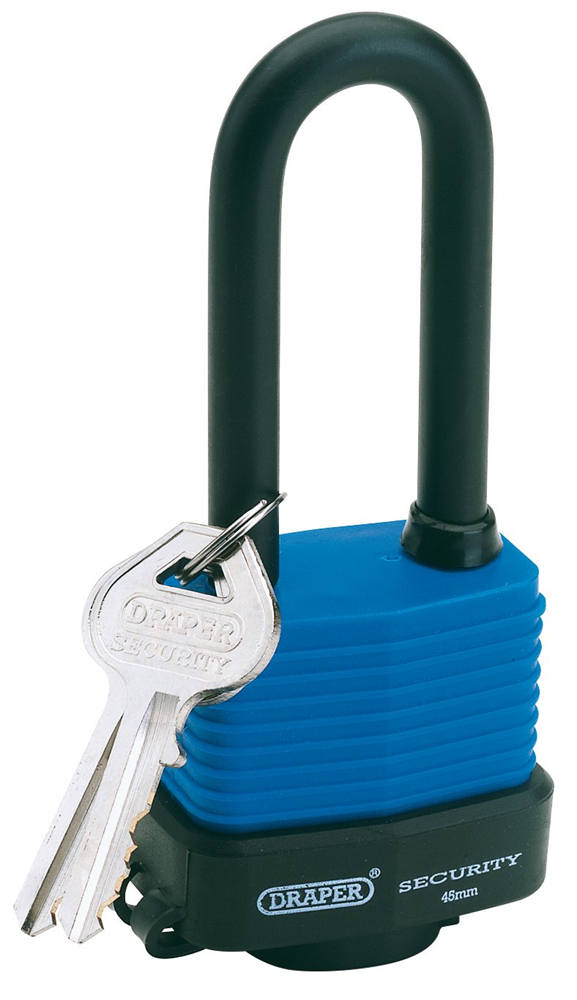 Laminated steel body with hardened, plated coating steel shackle, 67mm long. Precision pin tumbler and brass cylinder. Special bumper to prevent damage to locked item. Inside shackle size 18 x 59mm. Supplied with two keys. A key blank is available.
