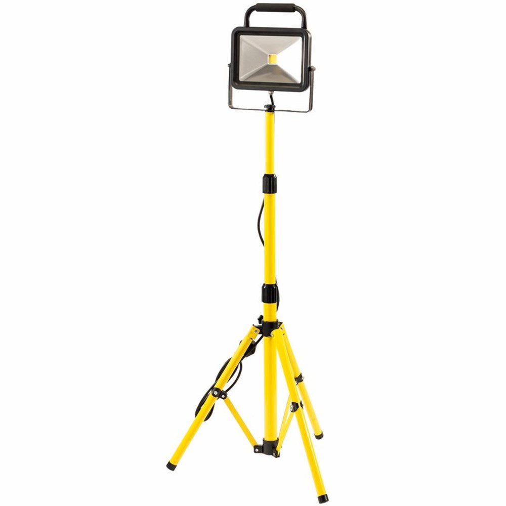 Ultra thin flood lights on an adjustable tripod. Incorporating COB LED technology, which provides the unit with a highly efficient super bright lumen output. The light housing is made from cast aluminium with a toughened glass lens, and attached to a steel tube floor stand with foam handle, all manufactured to IP65 specifications making them suitable for external use. Supplied complete with 3M cable and plug.###Manufactured to IP65 Specifications