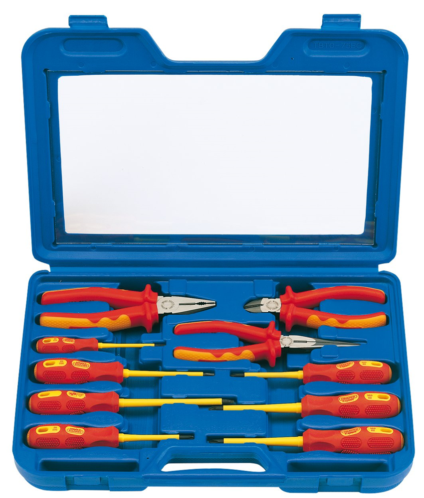 Expert Quality, tested to 10kV, suitable for working on live circuits of 1kV AC and 1.5kV DC. Pliers are drop forged from chrome vanadium steel correctly hardened and tempered with additionally induction hardened cutting edges. Each of the pliers have been individually tested to 10,000V for safe 1000V AC or 1500V DC live line working. Lacquered finish for corrosion protection with heavy duty, fully insulated, soft grip handles with slip guards. Screwdrivers are made with SVCM alloy steel blades which are hardened, tempered and chemically blacked. Fully insulated ergonomic soft grip handle with deep set blade sheath for total safety. in blow mould case with see - through lid.