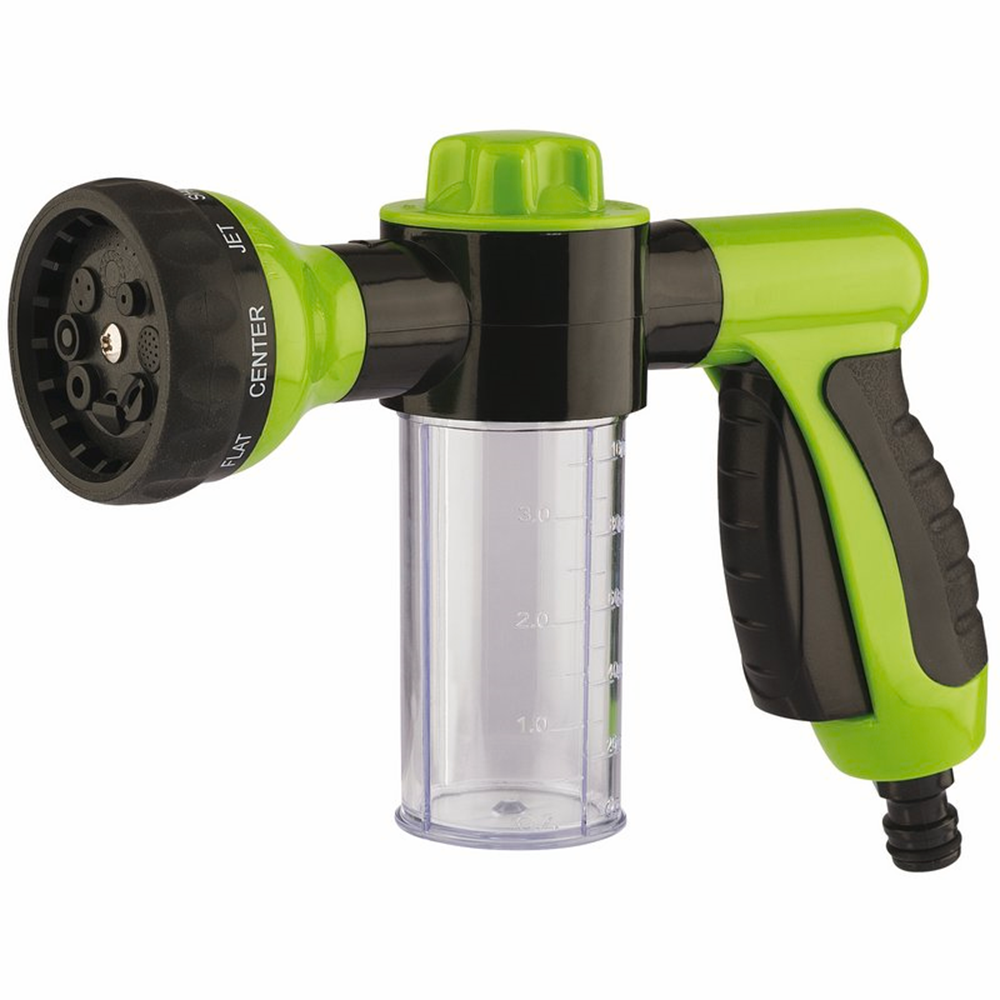 Eight pattern gun with trigger grip handle and reservoir to hold liquid soap. Reservoir holds 100ml/3.1/2 oz of liquid with control button to alter mix. Ideal for washing cars. Nozzle can be adjusted to give eight patterns: shower, mist, cone, rinse, stream, flat, centre and jet.