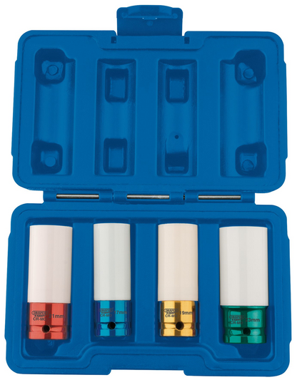 Expert Quality, set of four 6 point Draper Expert HI-TORQ° socket sizes 17, 19, 21 and 23mm. Manufactured from chrome molybdenum. Fitted with internal and external nylon sleeve preventing damage to wheels and nuts when in use. Supplied in plastic storage case.