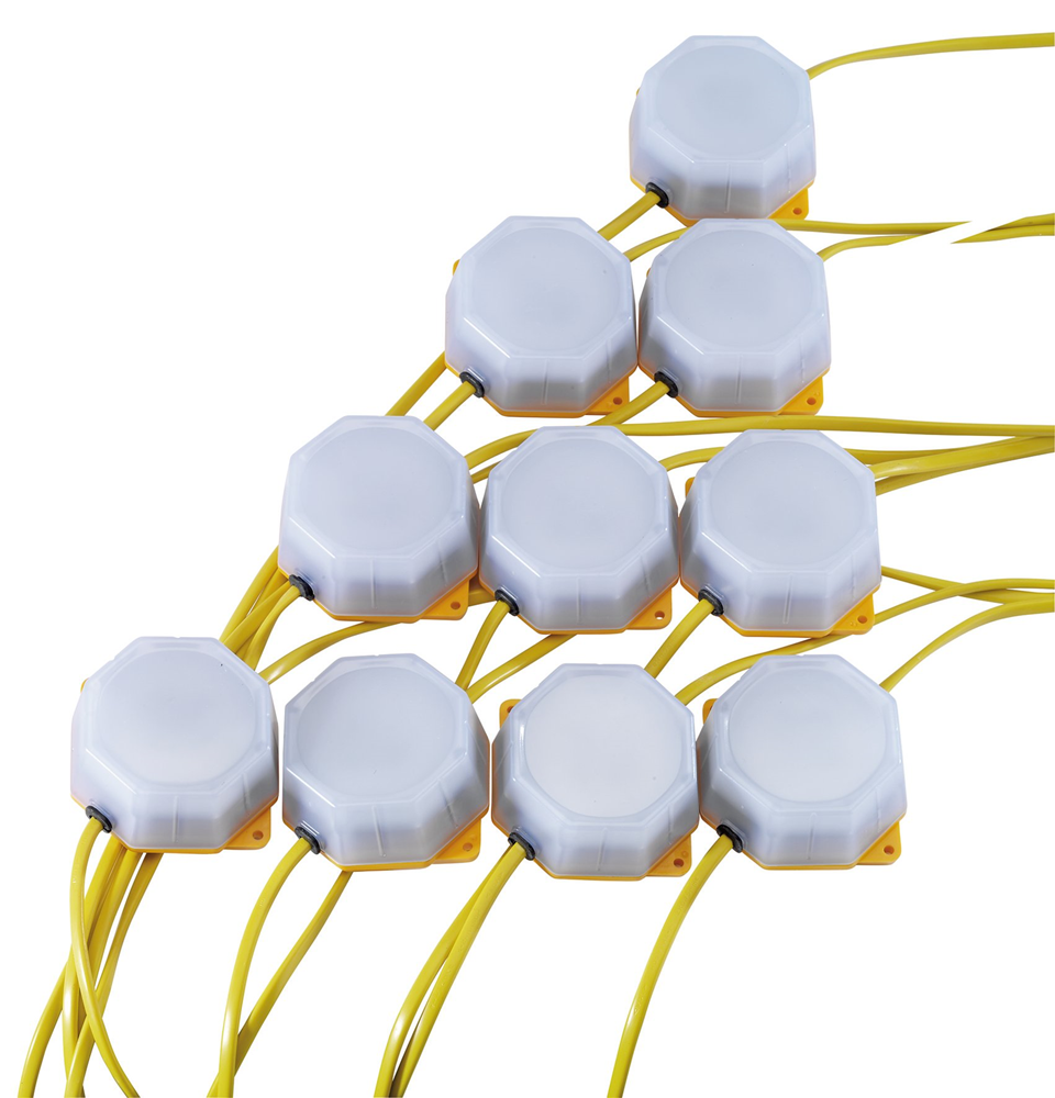 10 x 4W SMD LED festoon lights. Attached to a 110V 16A plug and attached with 22 metres of cable delivering a total of 3800 lumens. Each light is made from shockproof plastic with frosted lens caps. Suitable for use on building sites.