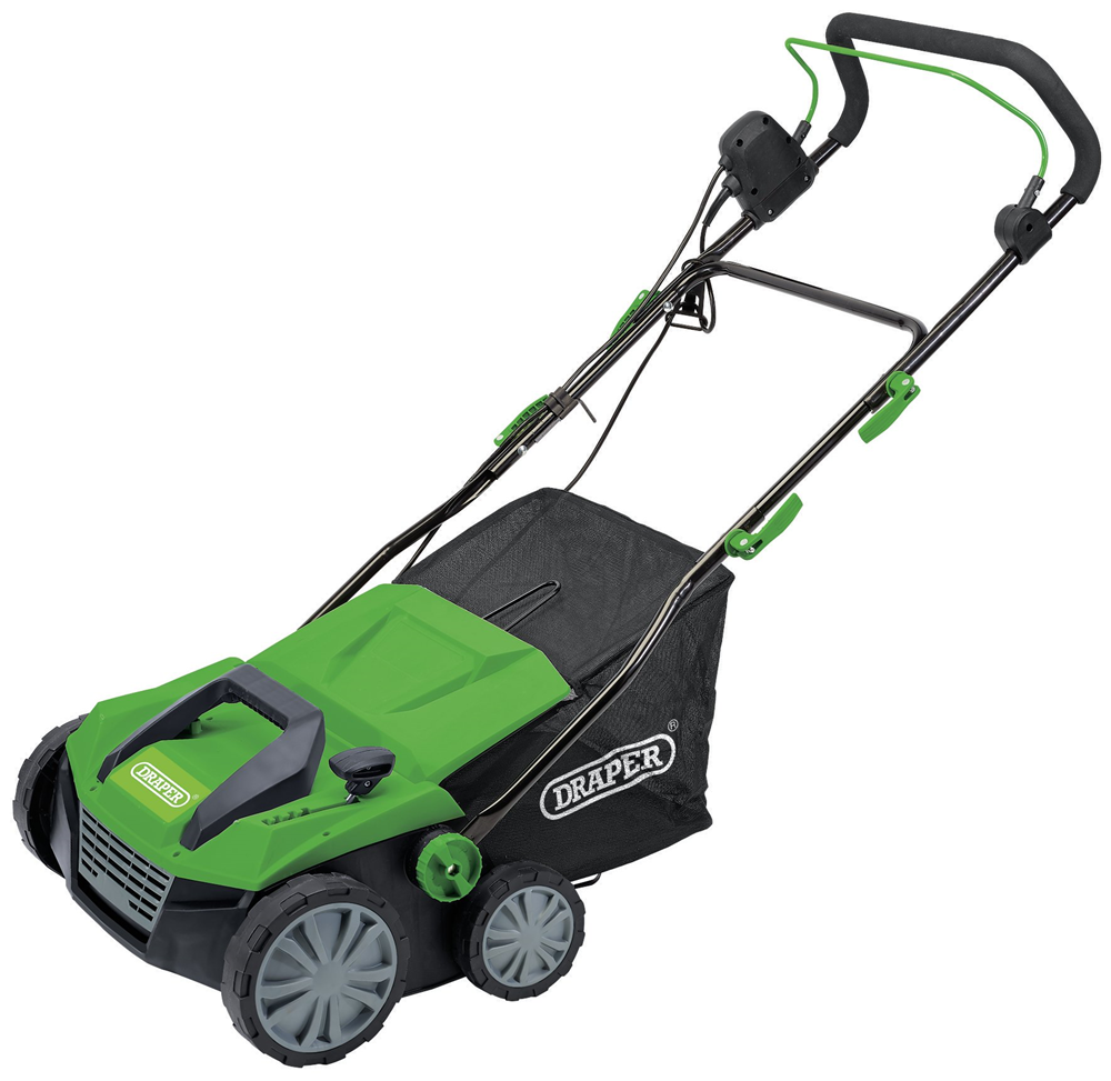 Powered by a 1800W motor, this 2-in-1 aerator and scarifier has a 380mm working width and can operate at five adjustable working depths for the aerator and scarifier. Supplied with two quick change cartridges: an eight-blade scarifying cartridge and a 20-tine aerator cartridge. Foldable handle for easy storage.