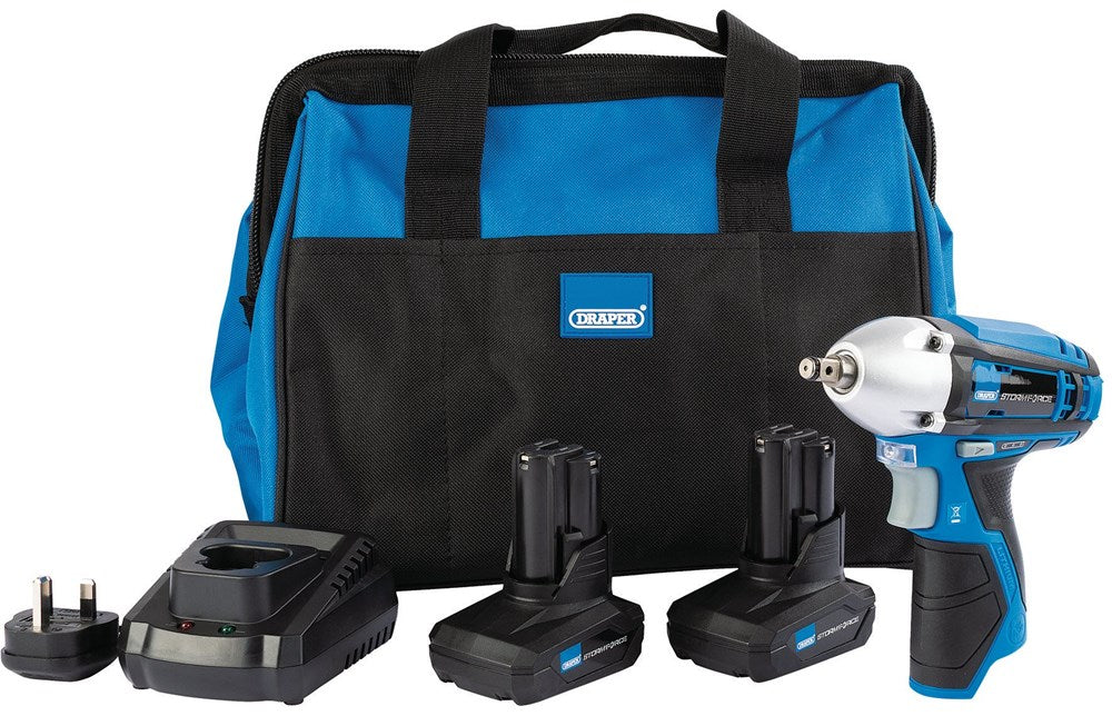 Part of the Draper Storm Force« 10.8V Interchange range, this kit features a 3/8" sq. dr. impact wrench (80Nm). Complete with 2x 4Ah li-ion batteries, a one - hour charger and a 320mm, water repellant, hard bottom tool bag for easy transportation and storage. Draper Storm Force« 10.8V interchangeable battery system allows you to combine one battery with any of the tools within the 10.8V Storm Force« series (not compatible with Draper Storm Force« 20V).