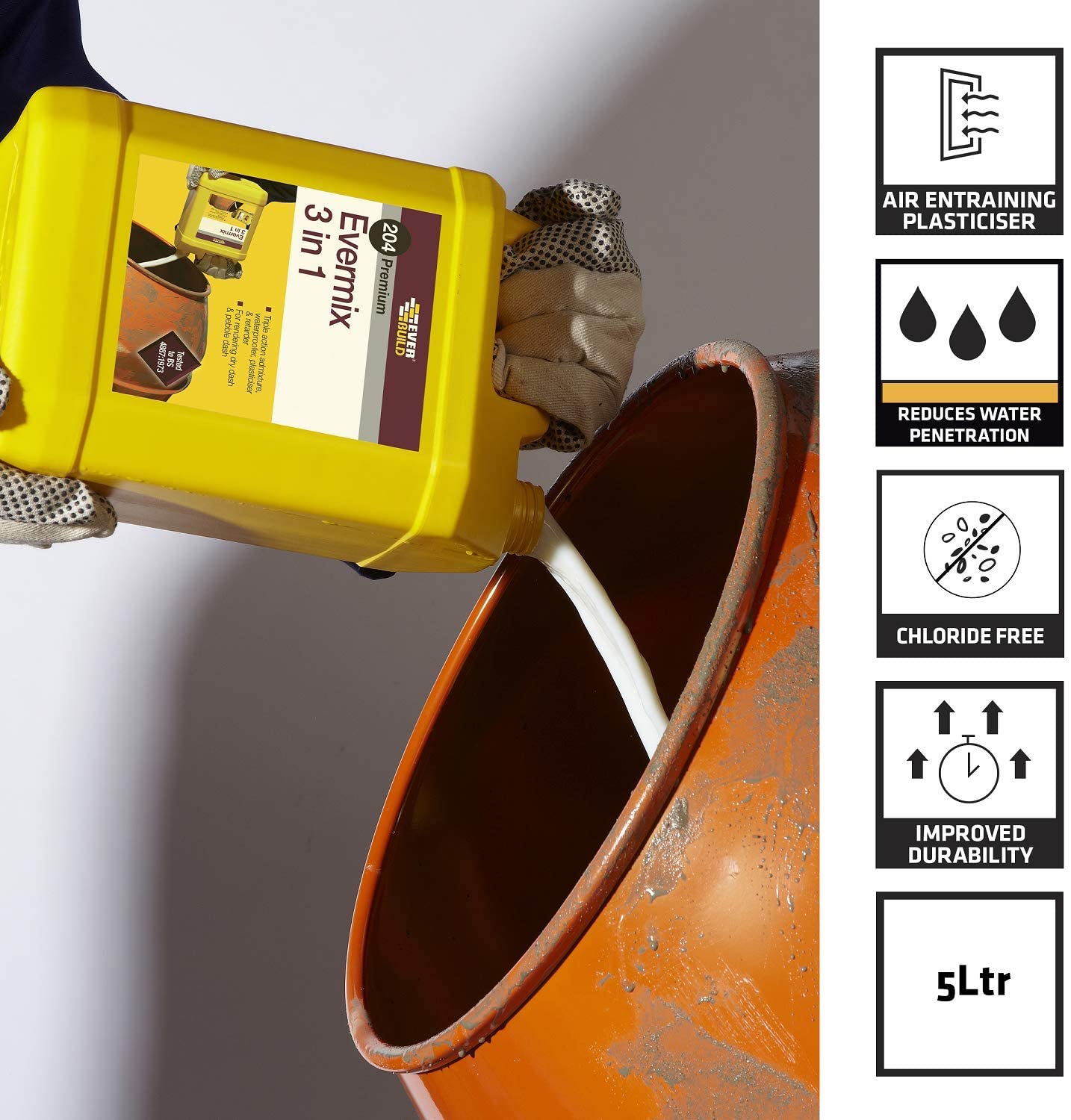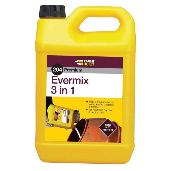 Evermix 3 in 1 triple action admixture waterproofs, plasticises and retards to assist workability, reduce water penetration and allow larger areas to be covered in one application.