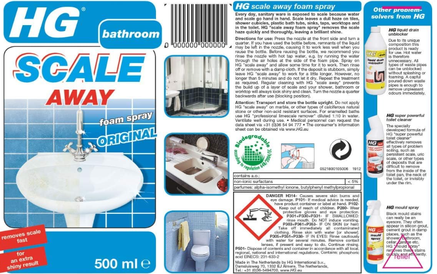The HG Professional Scale Away limescale remover foam spray (500 ml bottle) is a highly concentrated professional-grade bathroom scale remover, ideal for the safe removal of stubborn limescale and deposits in your home.