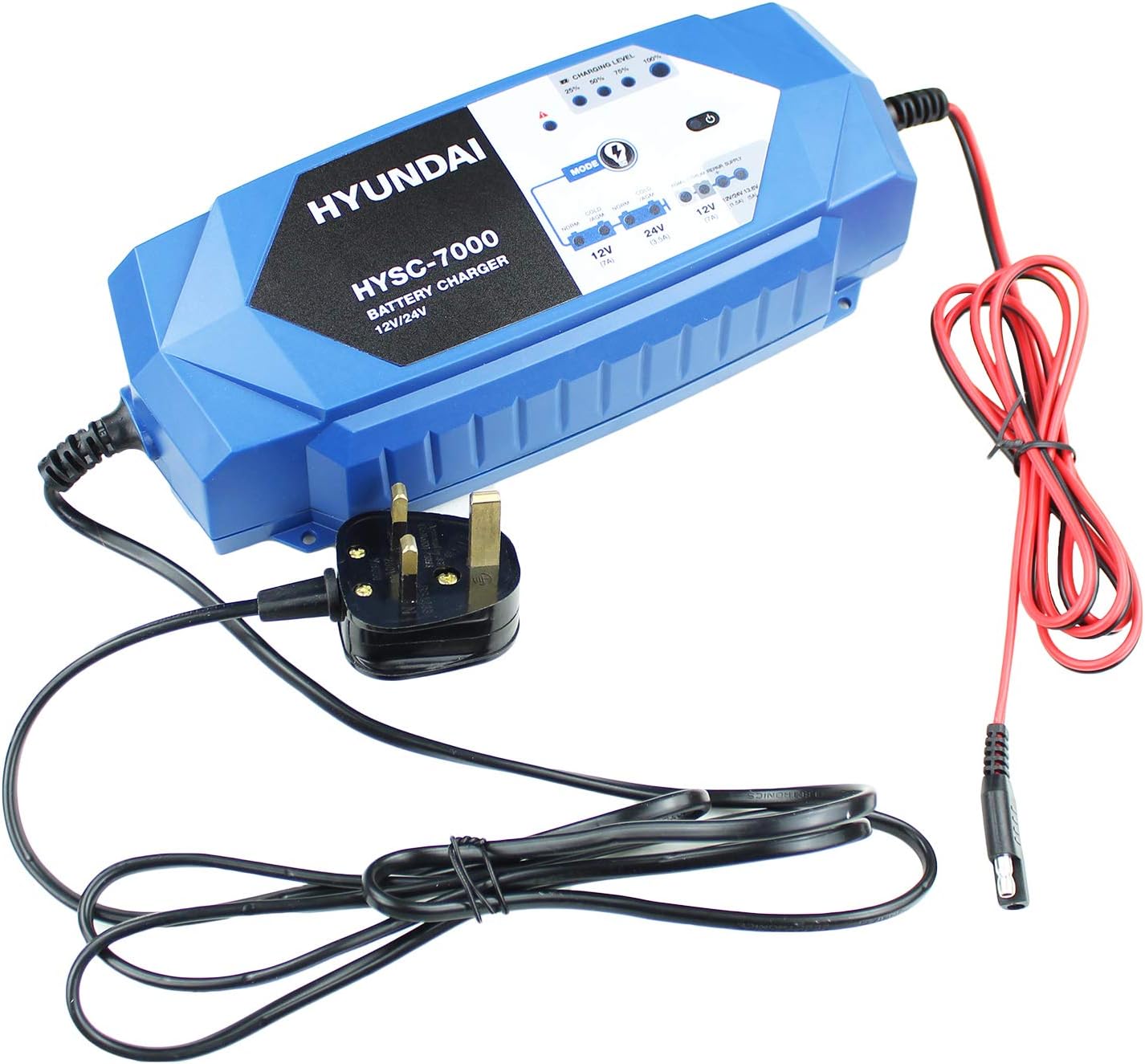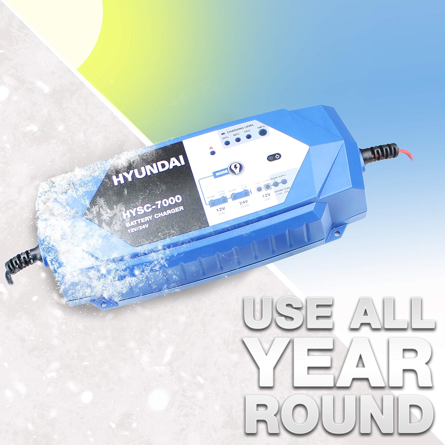 The HYSC-7000 is a smart 230v car battery charger from Hyundai, ideal for restarting a flat battery in your car, van, motorbike or motorhome.