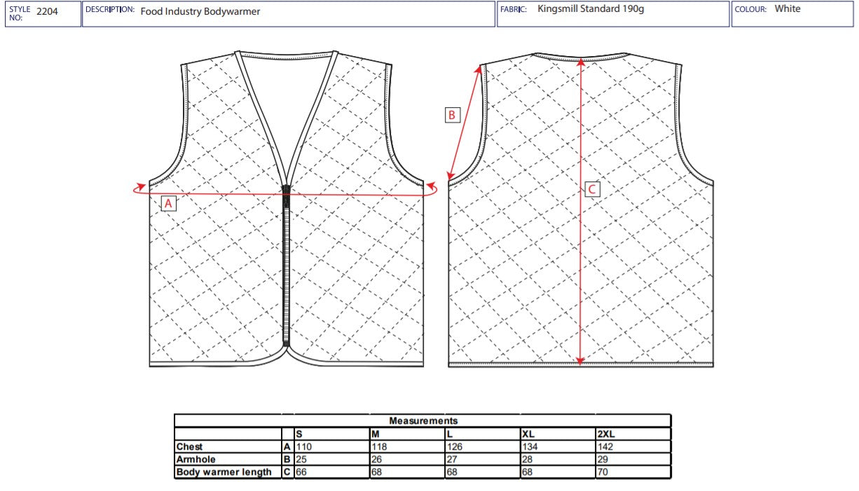 This bodywarmer is the ideal solution for cold working conditions in a food preparation environment. Featuring diamond quilt stitching this bodywarmer is fully lined and padded. Offers an internal pocket for secure storage.