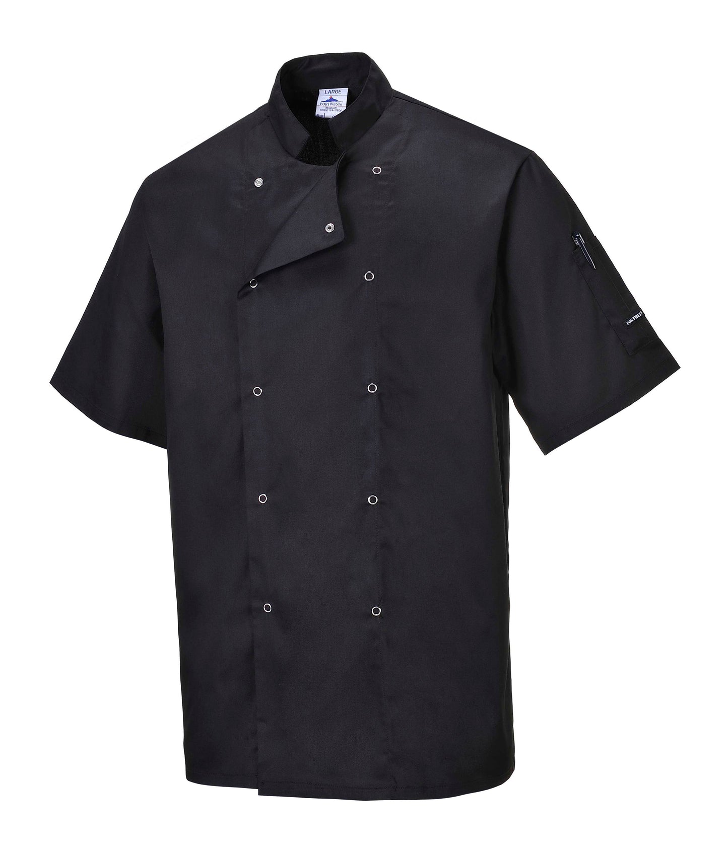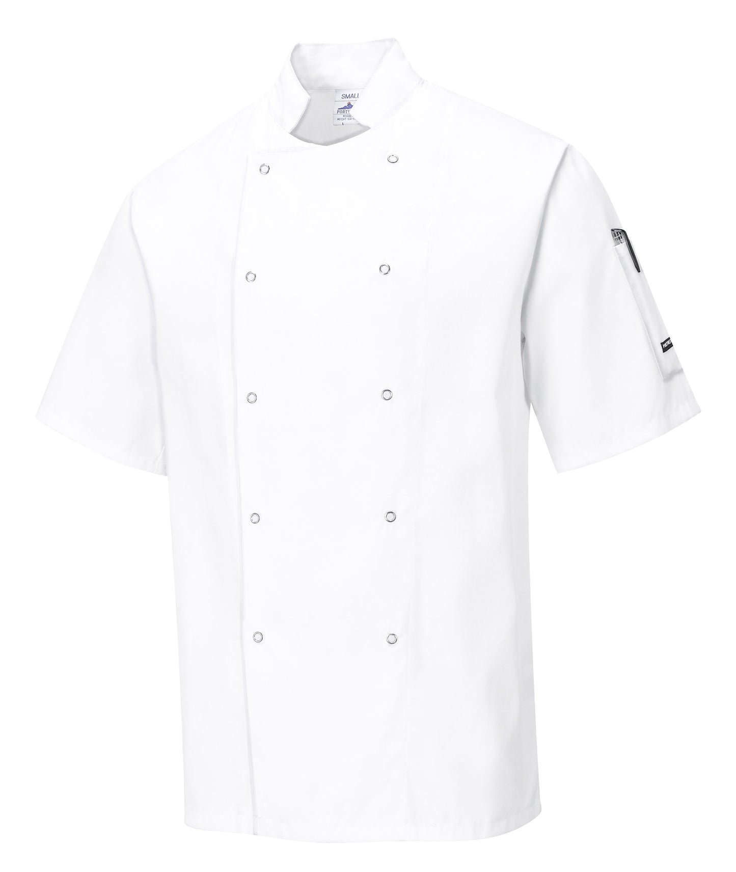 This modern and sophisticated jacket will meet the needs of all your team. The lightweight and durable fabric works to keep you cool and will ensure you look your best wash after wash. Features include a mandarin collar, stud front and handy sleeve pocket.