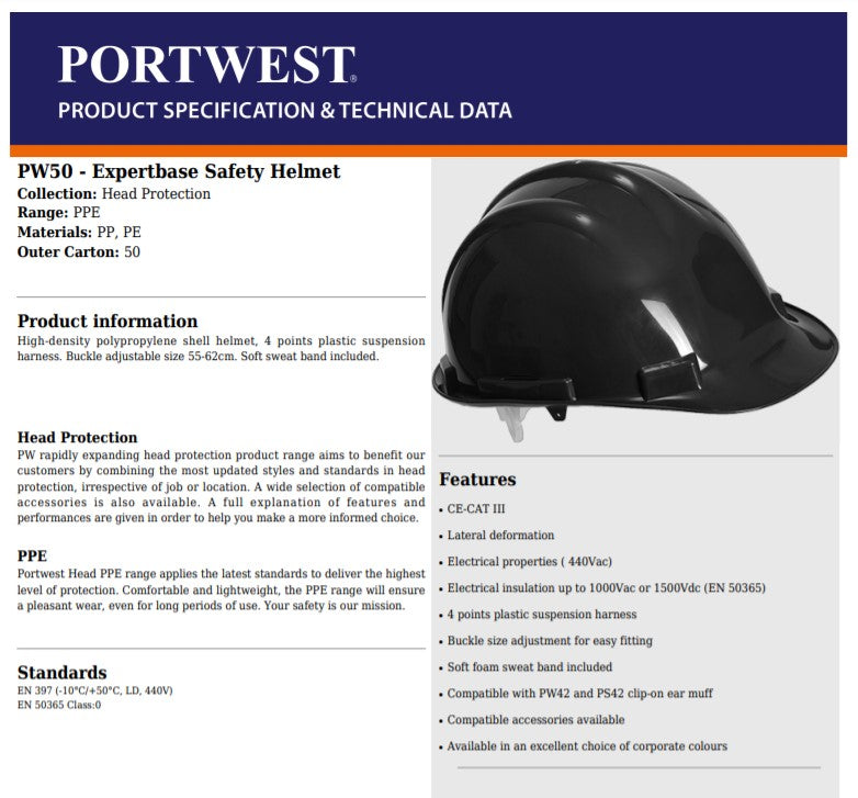 High-density polypropylene shell helmet 4 points plastic suspension harness. Buckle adjustable size 55-62cm. Soft sweat band included..