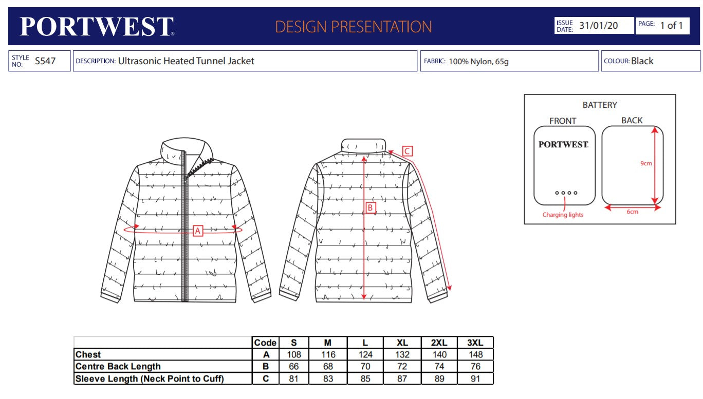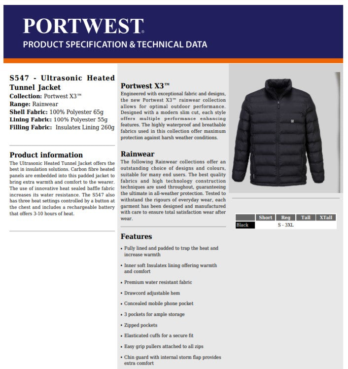 The Ultrasonic Heated Tunnel Jacket offers the best in insulation solutions. Carbon fibre heated panels are embedded into this padded jacket to bring extra warmth and comfort to the wearer. The use of innovative heat sealed baffle fabric increases its water resistance. The S547 also has three heat settings controlled by a button at the chest and includes a rechargeable battery that offers 3-10 hours of heat..