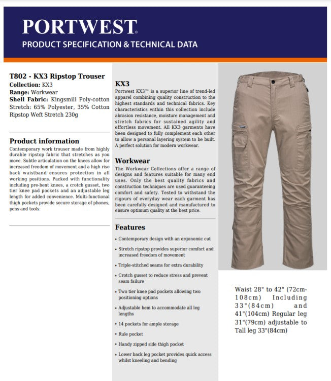 Contemporary work trouser made from highly durable ripstop fabric that stretches as you move. Subtle articulation on the knees allow for increased freedom of movement and a high rise back waistband ensures protection in all working positions. Packed with functionality including pre-bent knees a crotch gusset two tier knee pad pockets and an adjustable leg length for added convenience. Multi-functional thigh pockets provide secure storage of phones pens and tools..