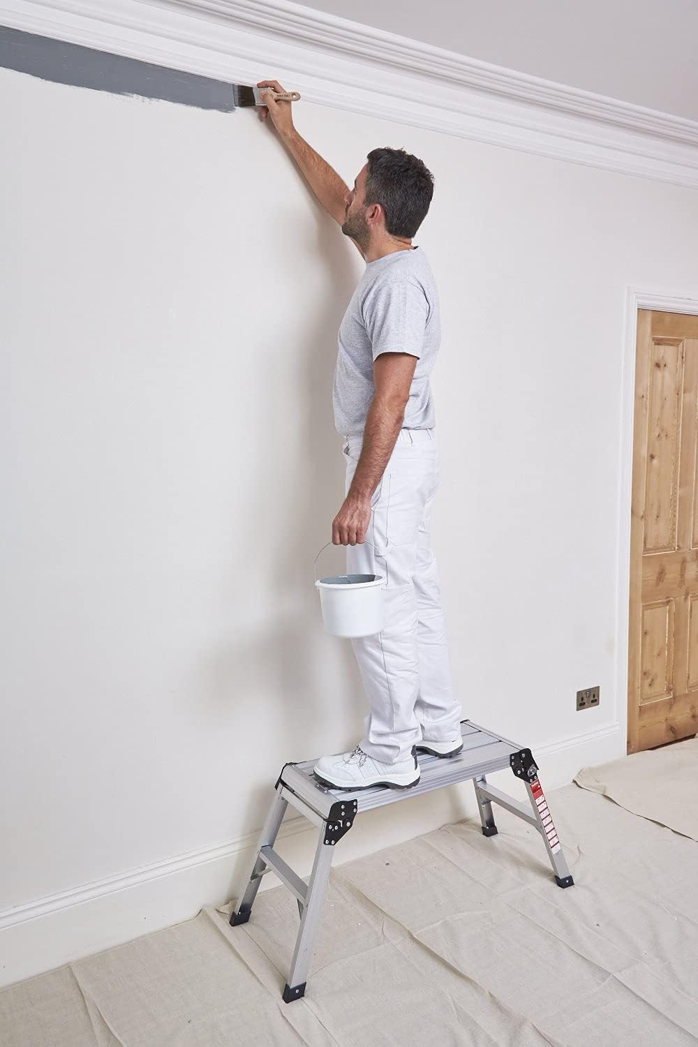 This portable work platform makes working above head height a breeze, extending your reach by 500mm (almost 2 feet). Suitable for both trade and DIY use, it's ideal for a range of tasks including painting, papering and cleaning of walls, ceilings and windows and much more. Unlike small stepladders, there's no constant unfolding to position it then folding up again when you need to move it: it has folding legs that lock into place with sturdy locking clips at the start of the job and the aluminium construction makes it lightweight enough to be moved quickly and easily without folding it down.