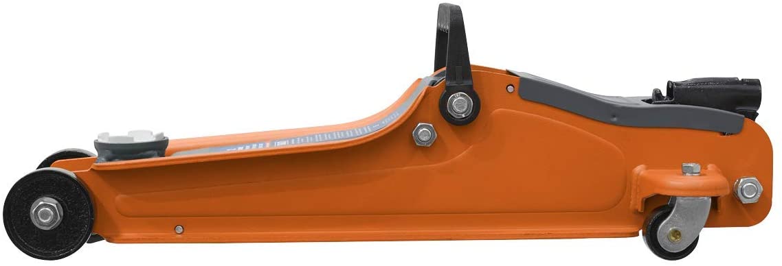 • Heavy-duty chassis with strengthening flanges along the top edge for extra torsional rigidity under load. • Profiled lifting arm allows low clearance height of just 85mm making this unit suitable for sports and custom cars. • Fitted with heavy-duty one-piece hydraulic unit with pump-through action preventing handle locking at maximum ram extension. • White saddle aids positioning under vehicle and safety valve prevents overloading.