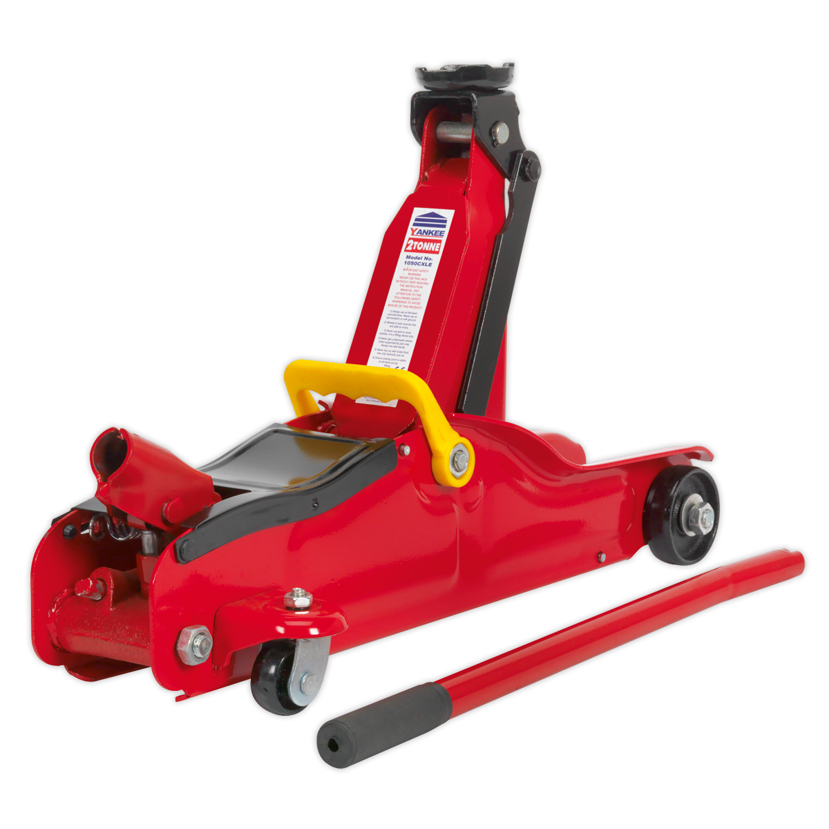 • Steel chassis with welded castor supports and one-piece hydraulic unit. • Fitted with overload valve, carry handle and finger cover for extra safety. • Profiled lifting arm allows low clearance height of just 85mm making this unit suitable for sports and custom cars. • Suitable for the hobby user or as an emergency mobile jack. • Includes one-piece pumping handle.