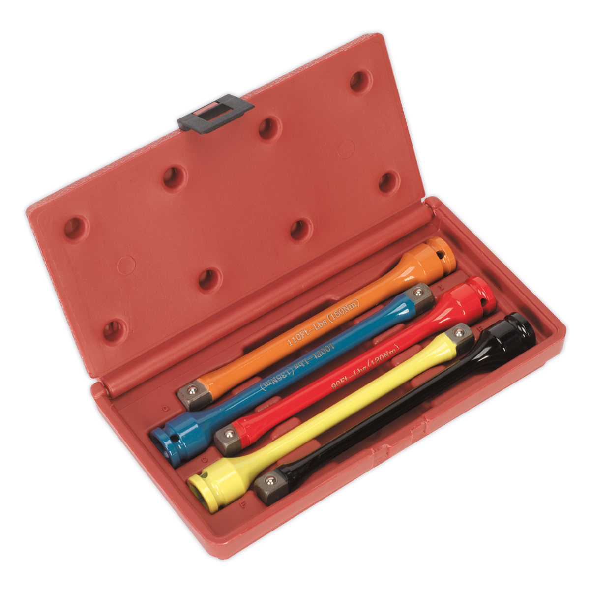 • Chrome Molybdenum steel torque sticks designed for use with air and electric impact wrenches. • Prevents over-torque of wheel nuts. • Anodised aluminium colour-coding for easy selection. • Features a twist distortion marking for checking serviceability of tool. • Supplied in storage case. • Lifetime guarantee*.