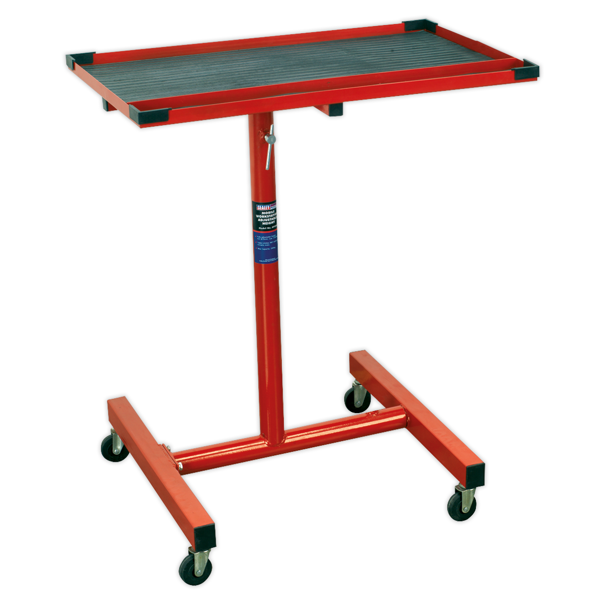 • Table is fully adjustable in height. • Features four compartments, one large for main workpiece and three equal sized smaller sections for accessories. • Rubber lining on the table helps prevent damage to the unit and workpiece. • Suitable for use in workshops and warehouses. • Supplied with four castor wheels.