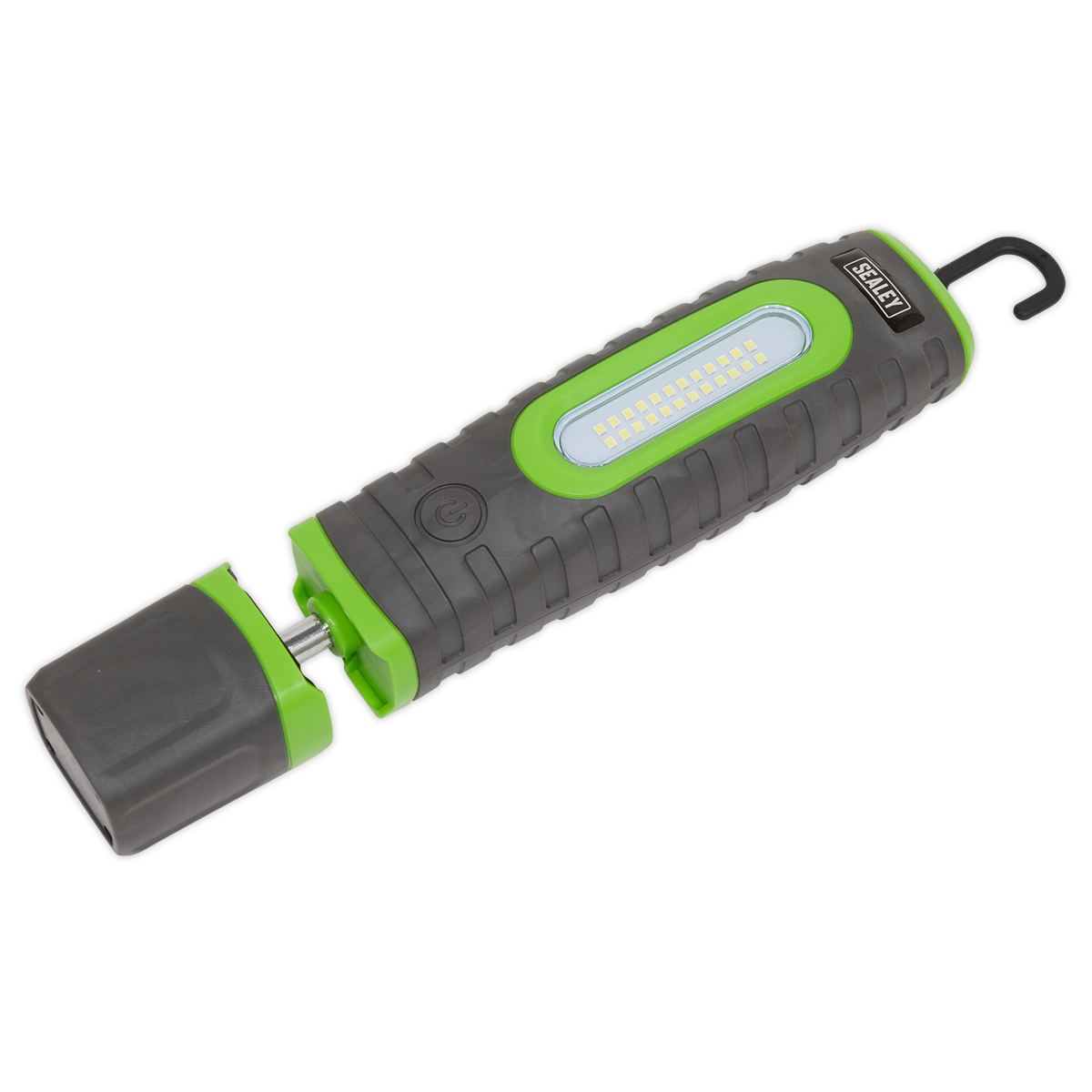 • Unique and innovative 360° swivel and tilt function enables the light source to be positioned in any direction. • Exclusive patented design owned by and registered to Sealey. • Each lamp houses 24 super bright SMD LEDs providing up to 1000 lumens output with 120° spread of light, illuminating the whole work area. • Includes an additional high power 3W LED directional torch. • Features two swivel hooks and three rubber covered magnets, two on the rear and one on the end, which allow hands-free operation. • Two high quality 3.7V 2.6Ah Lithium-ion batteries in parallel for up to 15 hours run time. • Micro USB charging port. • Supplied with USB cable.