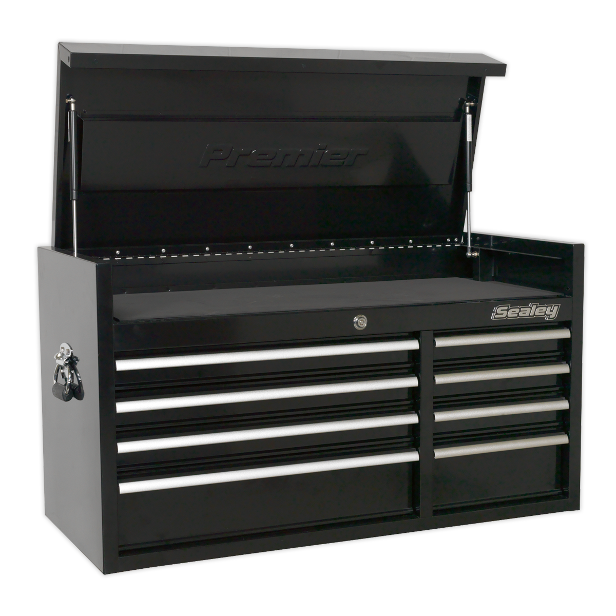 • Heavy-duty welded steel construction for strength and durability. • Textured powder coat finish. • Ball bearing drawer slides provide superior performance and carry heavier loads, double sets on large drawers. • All drawers have full width sand blasted aluminium 'Lift & Latch' drawer pulls, making easy-access while preventing inadvertent opening when box is being moved. • Heavy-duty exterior handles. • Supplied with non-slip drawer liners supplied for all drawers. • Gas struts fitted to lid makes opening easy. • Integral locking system locks all drawers with the turn of a key. • Supplied with two keys. • Use with Model No. PTB105511 Rollcab or can be a standalone unit.