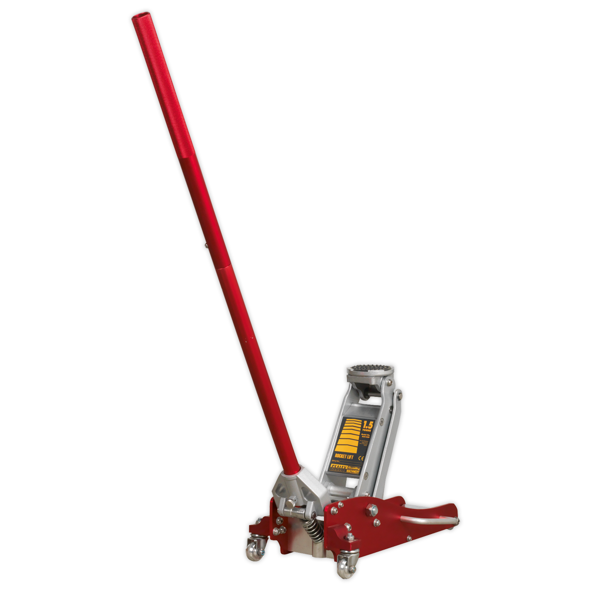 • Made primarily for the motor racing enthusiast, this jack weighs in at just 13.5kg. • Utilises many weight saving techniques such as a skeletal lift arm and polyurethane wheels. • Features Rocket Lift by use of twin pistons, bringing saddle up to jacking point with minimal pumps. • Polyurethane wheels for smooth and quiet manoeuvring, which also limits damage to garage floors. • Lifting bars are fitted either side of the anodised aluminium chassis enabling fast, lightweight pick-up.