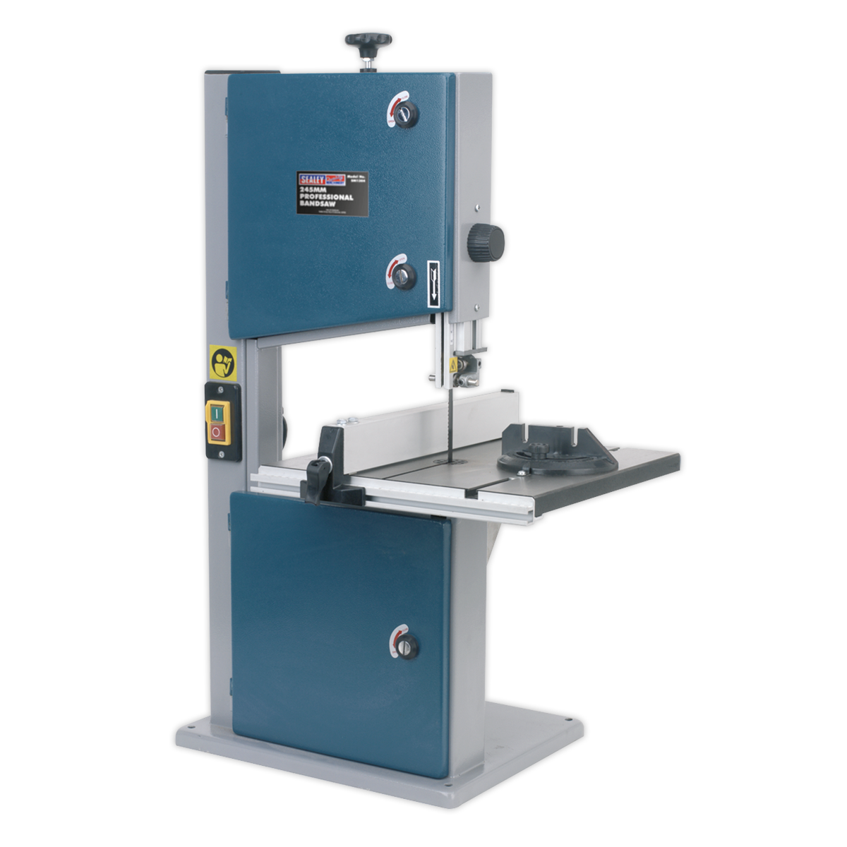 • Fully approved to current CE directives. • Steel chassis with locking blade wheel covers. • Bearing-mounted blade wheels and belt drive induction motor provide smooth operation. • 2-Speed operation enables bandsaw to cut multiple types of materials. • No-volt release switch prevents uncontrolled blade restart after power interruption. • Suitable for cutting wood and plastics. • Fitted with tilting table for cutting compound mitres. • Fitted with blade wheel brush to prevent dust accumulation and enhance blade life. • Features quick adjusting rip fence, mitre gauge, push stick and dust extraction port. • Supplied with metal stand.