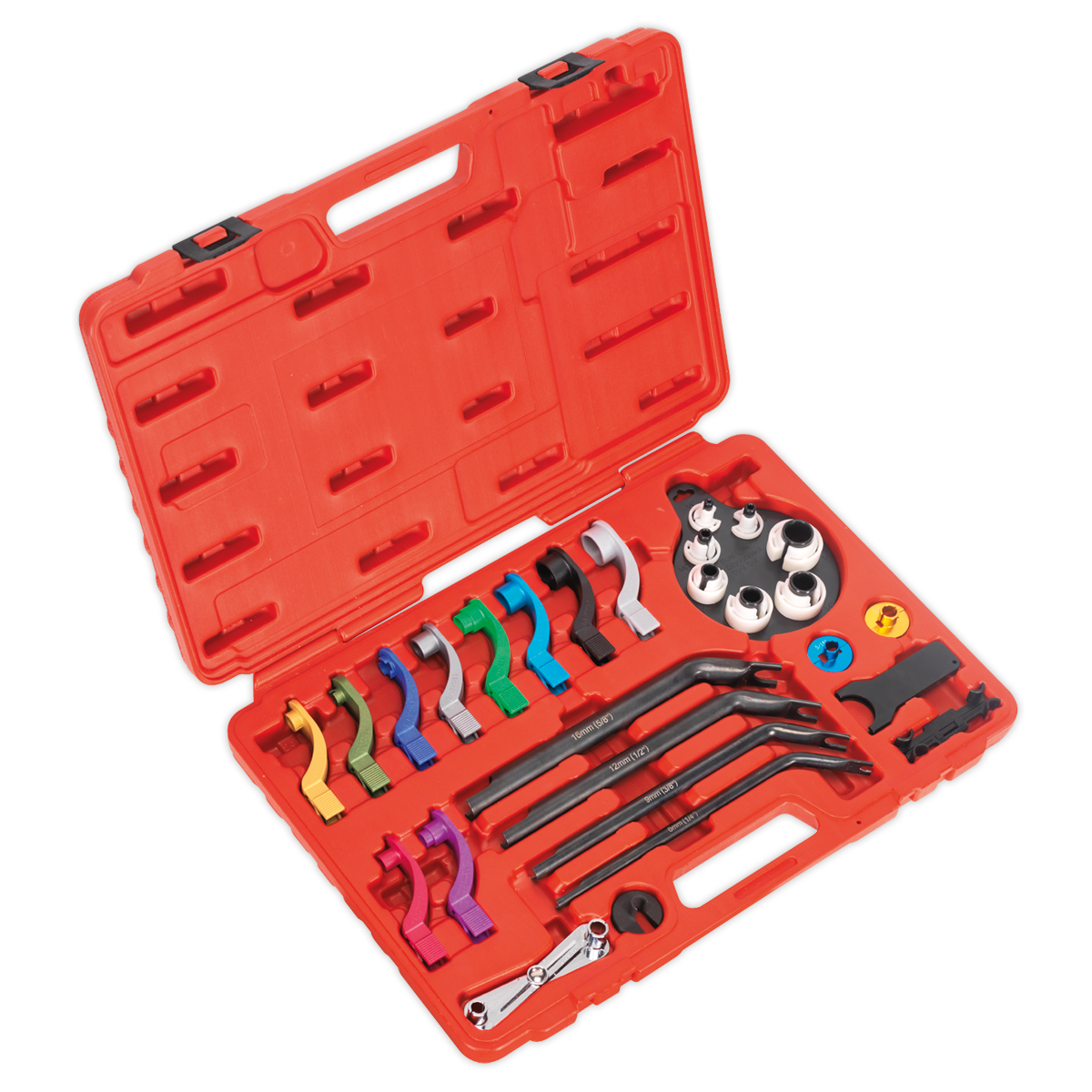 • Comprehensive automotive fuel line and air conditioning hose disconnection kit. • Suitable for a wide variety of vehicles. • Designed for radiators, transmissions, oil coolers and power steering lines. • Compatible with low profile fuel lines on a range of Ford and Vauxhall/Opel models. • Supplied in storage case.