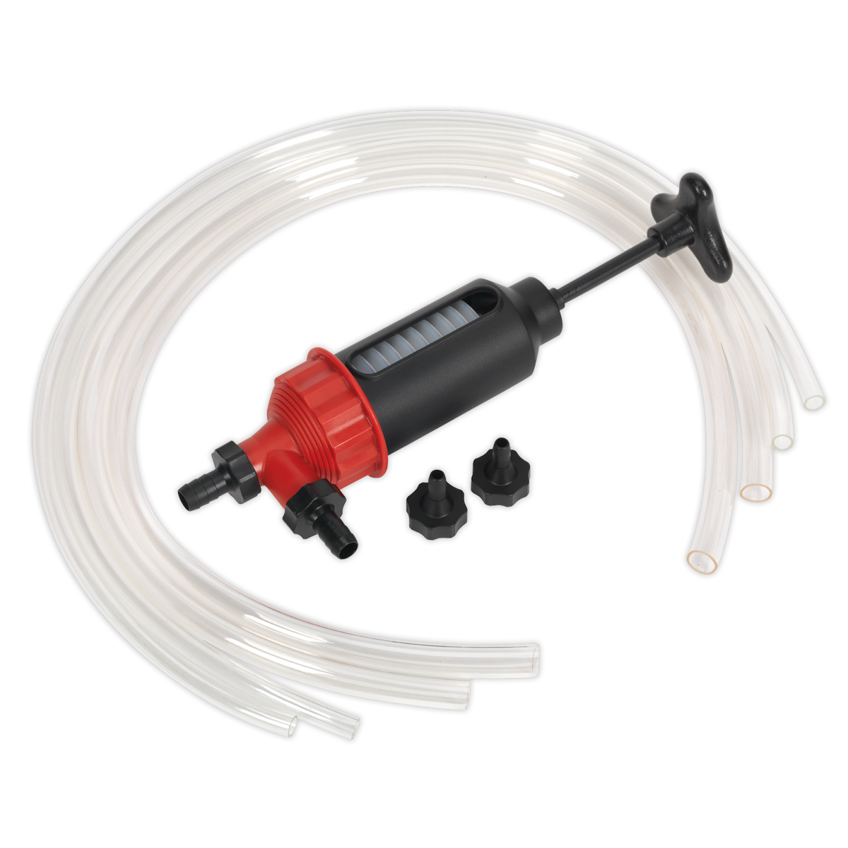 • Suitable for the syphoning of oil, petrol, diesel and non-aggressive fluids. • Supplied with intake and discharge hose sets. • Delivers approximately 9L/min.