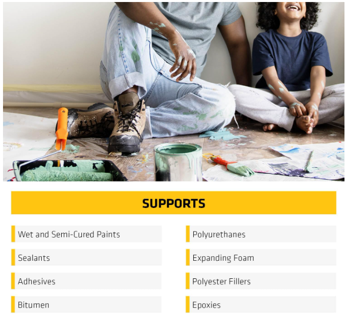 USES: Removes semi dry paint, sealant, silicone, adhesives, bitumen, expanding form, oil and grease from hands, tools and surfaces