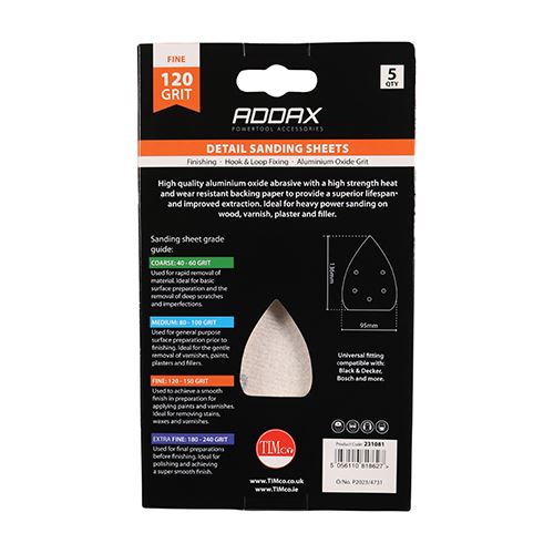 High quality aluminium oxide abrasive with a high strength heat and wear resistant backing paper to provide a superior lifespan and improved extraction. Ideal for heavy power sanding on wood, paint, varnish, plaster and filler. Detail Sanding Pads P120