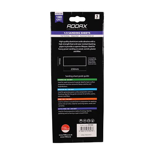 High quality aluminium oxide abrasive with a high strength heat and wear resistant backing paper to provide a superior lifespan. Ideal for heavy power sanding on wood, paint, varnish, plaster and filler. Unpunched 1/3 Sand Sheet P180